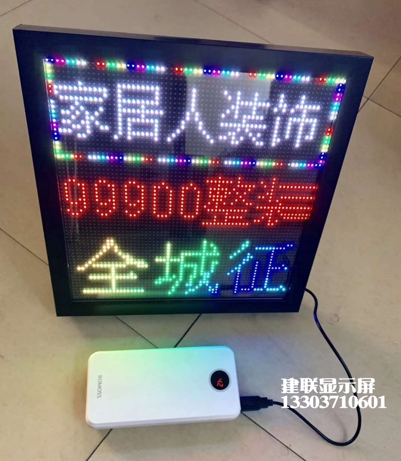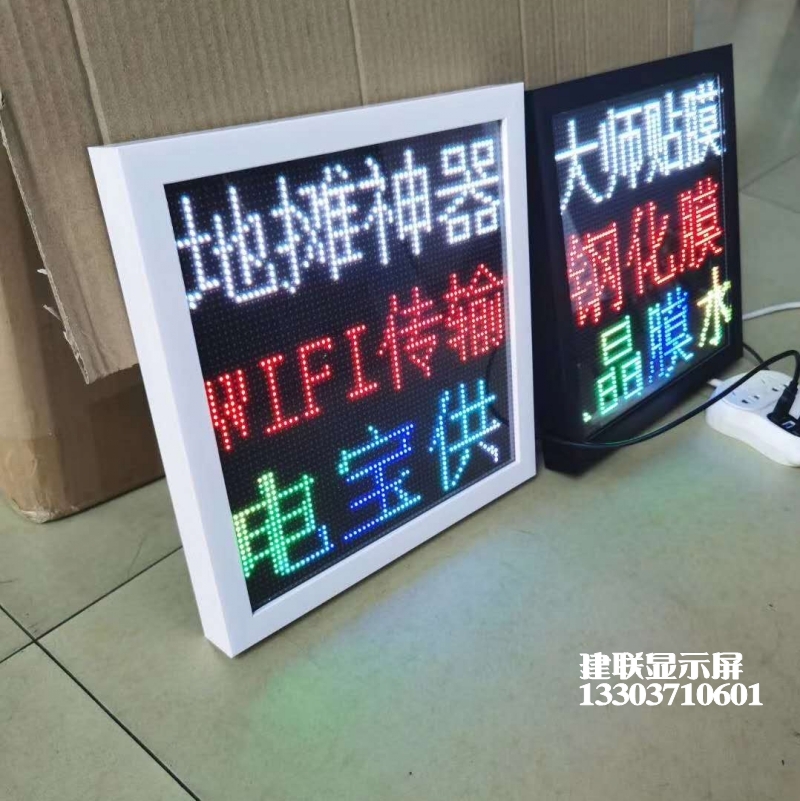 擺攤攤廣告屏,地?cái)侺ED顯示屏,地?cái)倽L動字幕,擺地?cái)偵衿?,設(shè)計(jì)非常的人性,黑白兩色外框,256mm*256mm顯示尺寸,外圍尺寸 296mm*296mm*30m手機(jī)WIFI傳輸 ,USB接口供電(1萬毫安充電寶可用6小時)