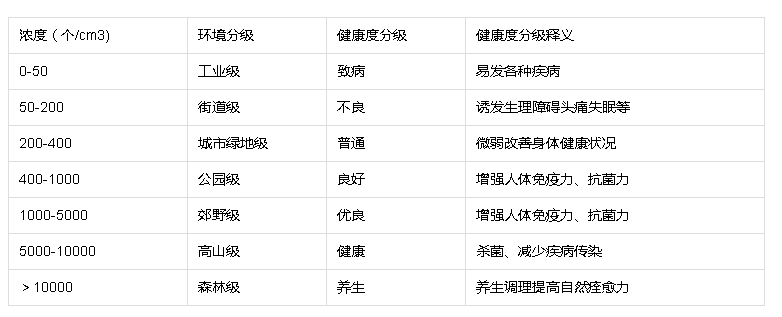 根據(jù)大氣負(fù)氧離子濃度大小劃分為兩類等級(jí):環(huán)境等級(jí)、健康等級(jí)。具體分級(jí)如下: